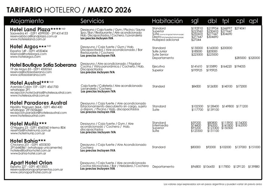 A continuación, se comparte el tarifario hotelero elaborado mensualmente por la Dirección de Turismo del Municipio de Bahía Blanca, donde se presenta el listado de alojamientos habilitados en la ciudad, los servicios que ofrecen y las tarifas correspondientes según la categoría de habitación. Es importante tener en cuenta que los valores están expresados en pesos argentinos y pueden variar hasta su contratación.